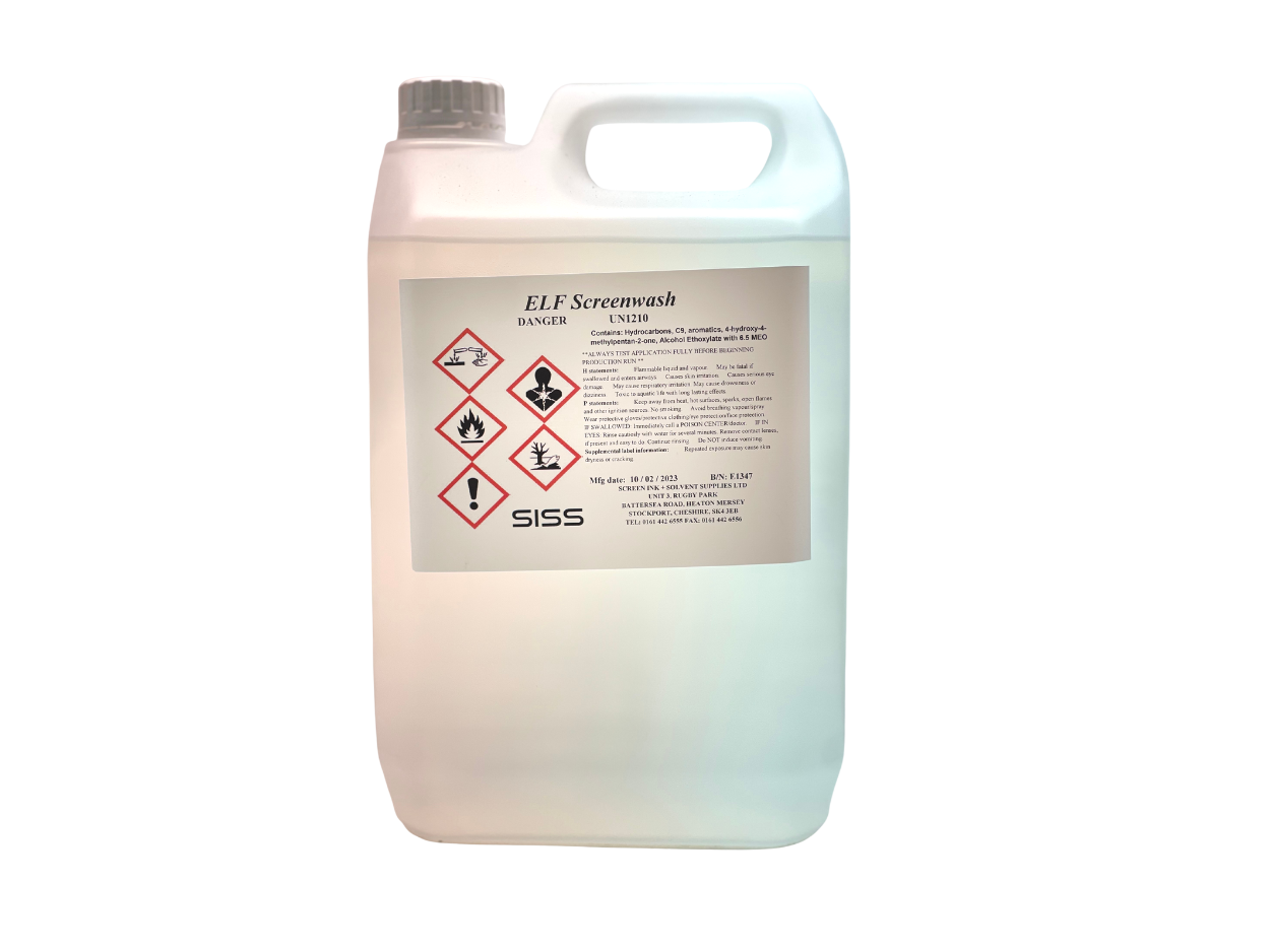 SISS ELF Screen wash is made using a blend of strong solvents which makes it perfect for the removal of most types of screen printing ink residues from screens.